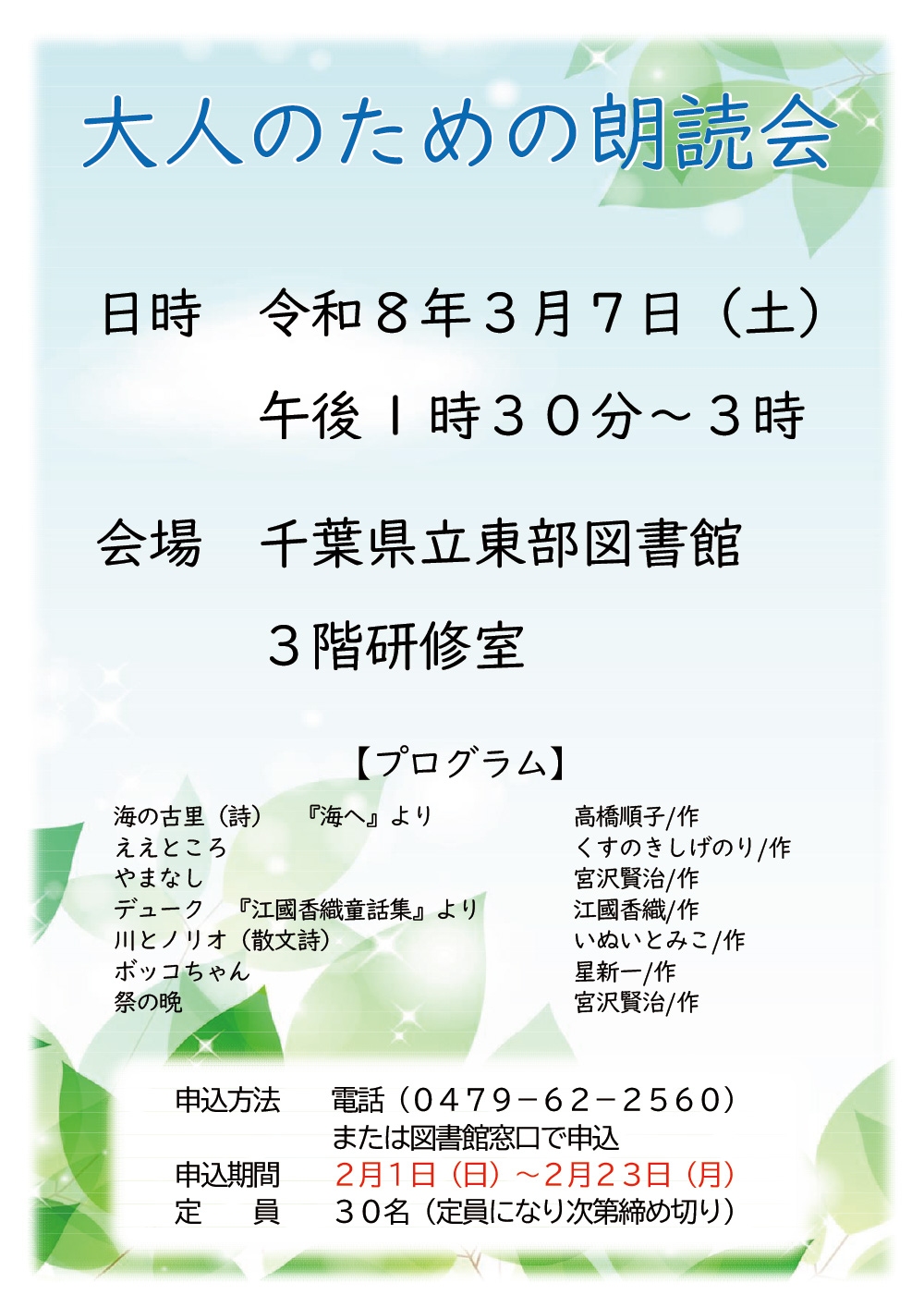 2026年1月30日 大人のための朗読会を開催します 詩や文学作品の朗読を聴いてゆっくりお過ごしください。 大人のための朗読会 日時 3月7日(土)午後1時30分〜3時 会場 千葉県立東部図書館 3階研修室 定員 30名(定員になり次第締め切り) 申込方法 電話(0479-62-2560)または図書館窓口で申し込んでください。 申込期間 2月1日(日)〜2月23日(月) 問い合わせ 旭市図書館 ☎0479-62-2560