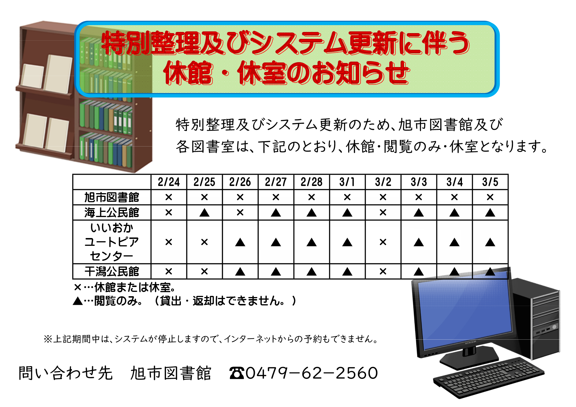 特別整理及びシステム更新のため、下記期間中、旭市図書館及び各図書室は、休館・閲覧のみ・休室となります。