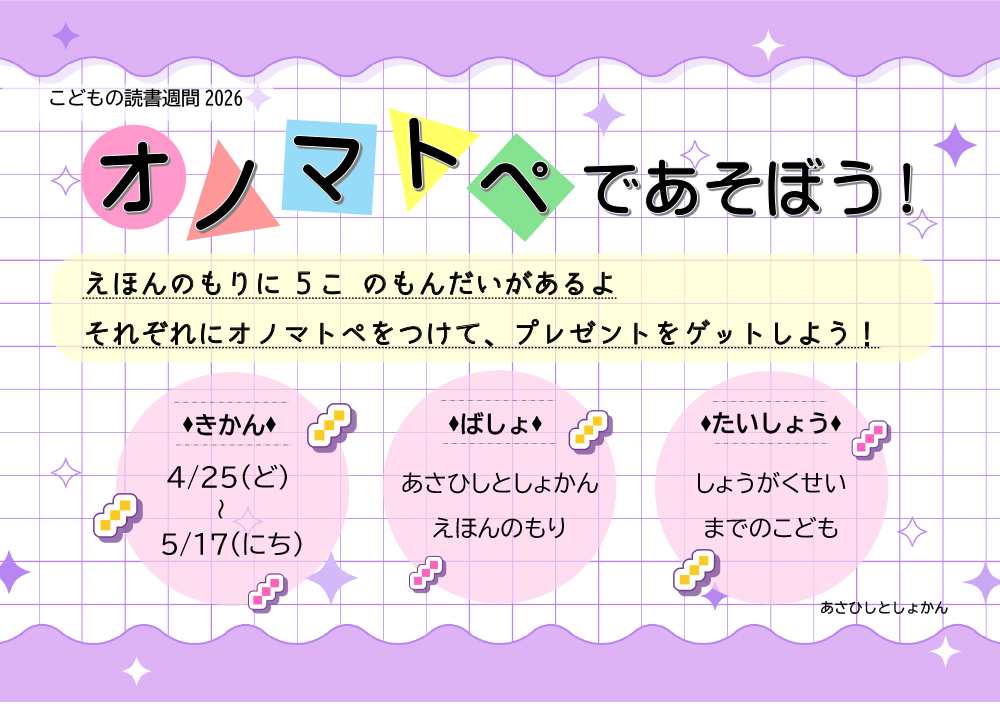 2026年4月15日 こどもの読書週間イベント【オノマトペであそぼう】 4月23日(水)から5月12日(月)は「こどもの読書週間」です。子どもたちにもっと本を!との願いから始まりました。 旭市図書館では、子どもたちが本と出会う場を提供するため、こどもの読書週間イベント【オノマトペであそぼう】を開催します。 期間 4月25日(土)~5月17日(日) 対象 小学生まで 場所 旭市図書館 えほんのもり
